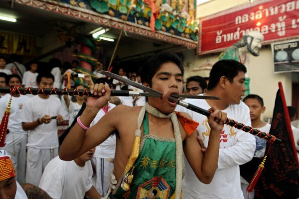 In late September and early October in Thailand held an unusual vegetarian festival. I order to Nine Emperor Gods give them good health and peace of mind, these people during the festival, which lasts 9 days, must comply with many rules. These days they do not eat meat, drink alcohol, have sex or wear white clothes, and must maintain body hygiene and kitchen accessories… What’s really spectacular is sticking various object height='360' width='490'>